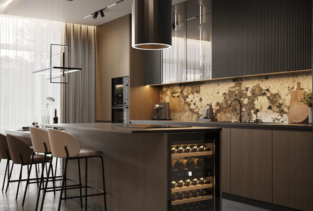 - Więcej możliwości aranżacji – kuchnia może płynnie przechodzić w jadalnię, a następnie w salon.