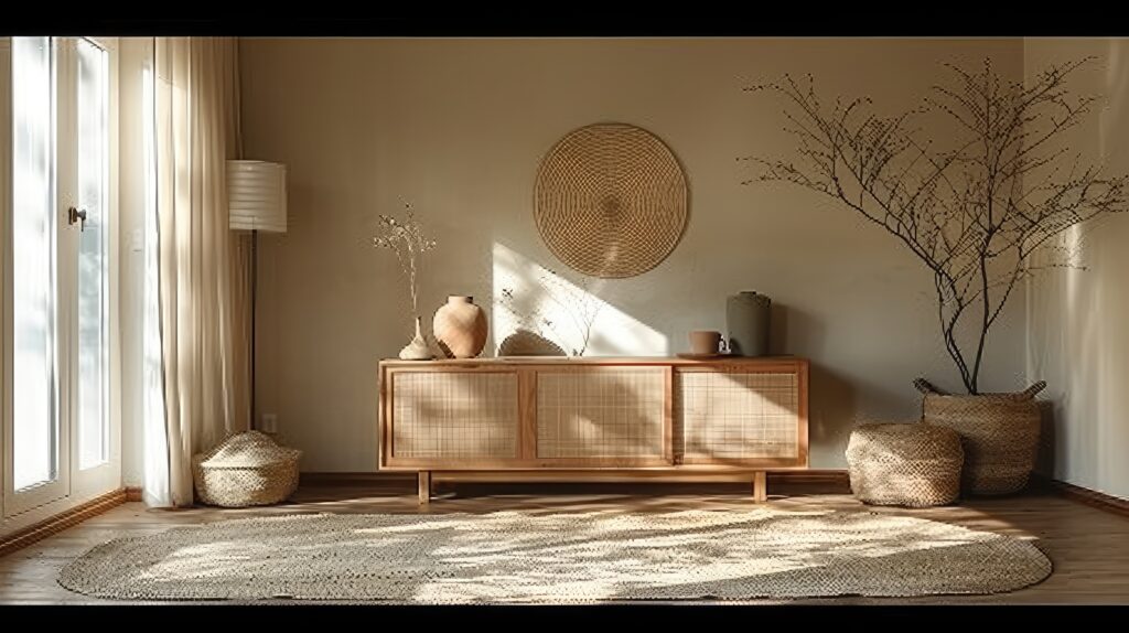 Materiały i tekstylia w stylu japandi: drewno w naturalnych odcieniach, len, bawełna, bambus, czerpany papier, ceramika.